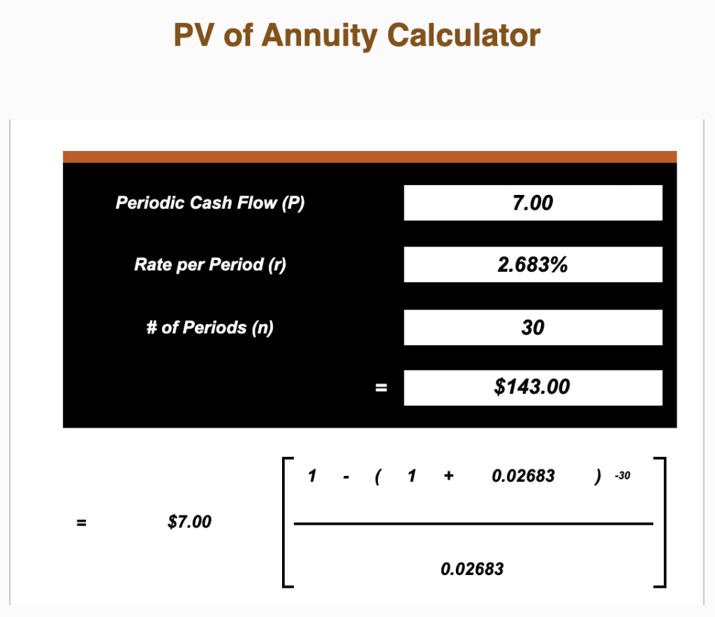 Using this funky little calculator, we can plug in the present value, 143 gold, the periodic payment, 7 gold, and the number of periods, 30 turns, and backsolve for the “rate per period”. In our case we get 2.683%.